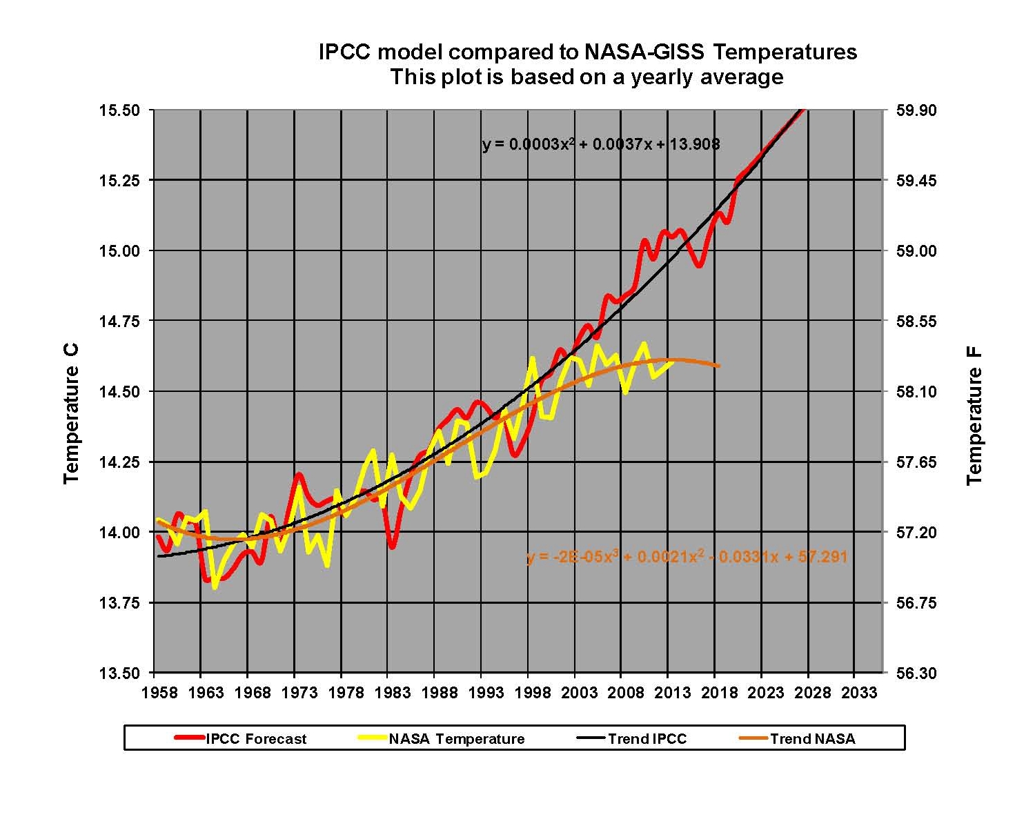 Although Carbon Dioxide did play a part, the real reason was that the long and short climate trends previously described in point seven were both moving up together; more on this in the next section. This can be seen in the IPCC estimated global temperatures shown in Figure 1 as the red plot when it is compared from 1958 to 2000 with the yellow NASA-GISS temperature plot (orange trend line added with equation) where the red IPCC plot moves in synchronization with the yellow NASA-GISS plot of estimated global temperature. However, after 2000 things began to change as the yellow NASA-GISS plot, and the orange trend began to move down while the red IPCC plot and trend continued to move up. Thirteen years have now passed and the IPCC still has no explanation for why global temperatures are trending down not up: so with no explanation we can say that the model is flawed and needs additional work before any estimates can be believed. This is clearly shown in Figure 2 where we added a high and low band of .15 degrees Celsius to the trend of the IPCC plot and they represent a deviation of +/- 1.0% from the mean. This shows where we can reasonably expect NASA-GISS temperatures to fall within; the IPCC has only 42 of 56 years between the high and the low bands for 75.0% inside the bands. The last time the NASA-GISS plot was inside the IPCC GCM bands was 2007 and the last time it was near the mean was 2002. There is no doubt that there is something seriously wrong here.