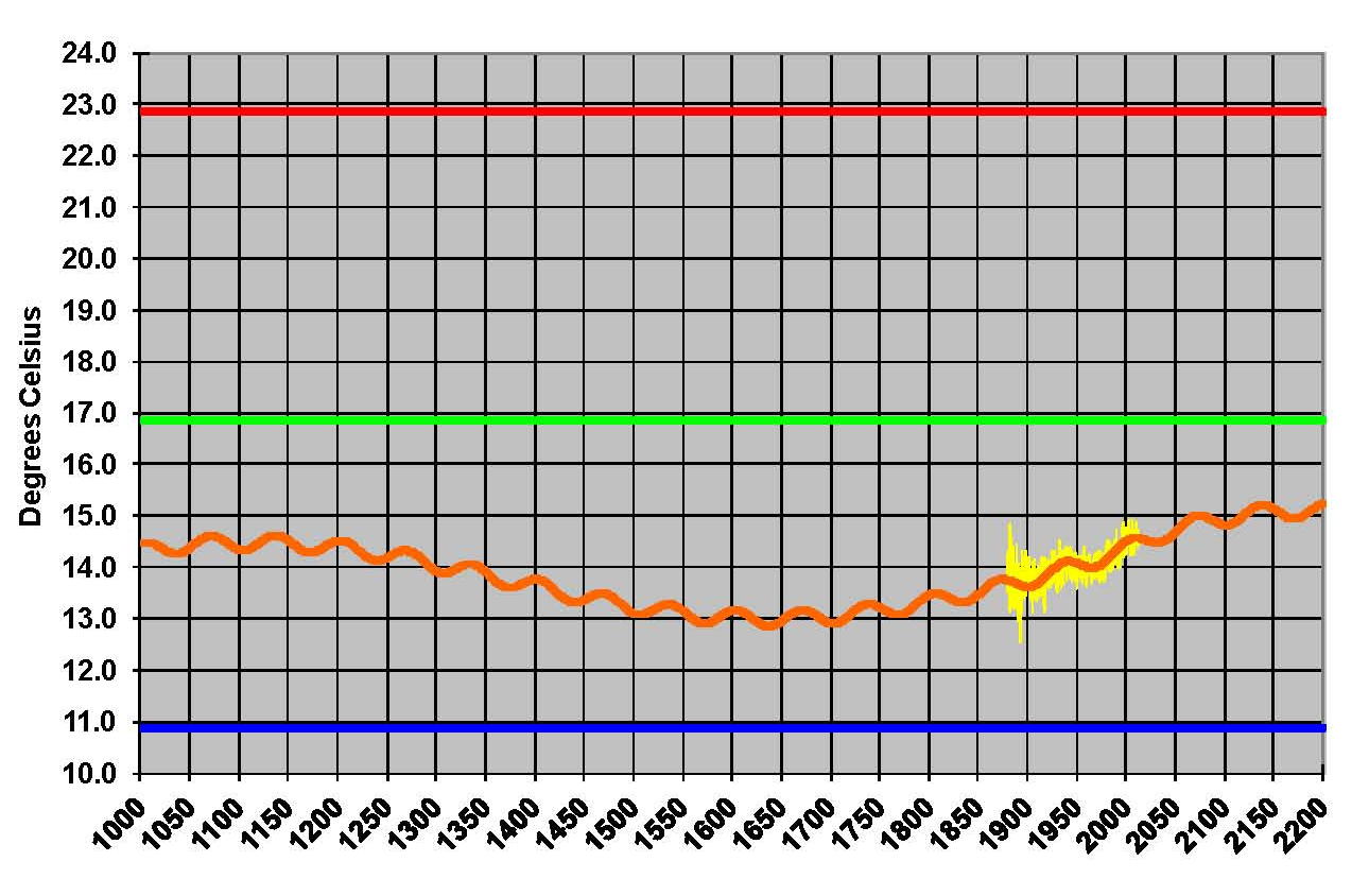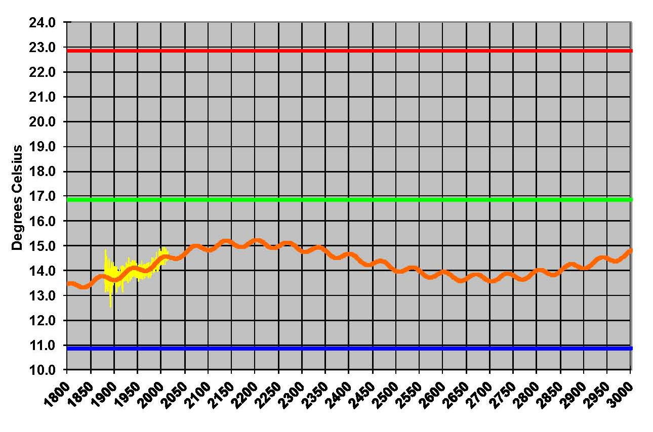 The next Graphic, shown from 1800 to 3000, the long and short cycles are also very obvious but it can also be seen that the pattern has been shifted up about 1 degree Celsius which is from the higher concentration of carbon dioxide. Carbon dioxide is taken up to a level of 800 ppm but long before it gets there the effect is has, has been mitigated. In essence the atmosphere has become saturated and Carbon no longer plays a role in the climate process. The IPCC admits that the sensitivity of CO2 could be as low as .4 or as high as 4.0 degrees Celsius in their Fourth Assessment Report (AR4). They use 3.0 degrees Celsius in their models which is toward the high side but what they don’t tell you is that if they used a lower value like .64 degrees Celsius as Dr. Lindzen suggests that their models will not work. Meaning it will not give the huge increase in temperature that they promote. The definition of that value appears to be the one thing that makes or breaks the IPCC’s case; so it would seem to me that we would want to know whether its 3.0 or .64 degrees Celsius. No one at the iPCC is looking at it that I am aware of at this time.