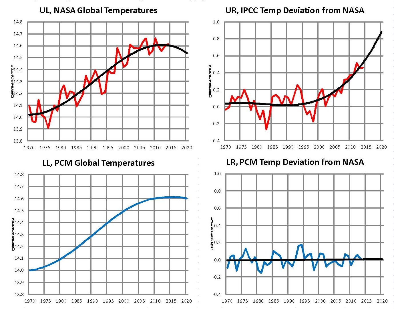 The last plot LR in blue uses the same logic as used in the UR plot, here we use the PCM estimates of what the Global temperature should be with the NASA actual temperatures’ subtracted from them. A positive value indicates the PCM values are higher than actual and a negative value indicates the PCM values are lower than expected. A black trend line was added and it clearly shows that the PCM model is tracking the NASA actual values very closely. In, fact since 1970 the PCM model has rarely been off by more than +/- .1 degrees Celsius and has a trend of almost zero error, while the IPCC models are erratic and are now approaching an error rate of +.5 degrees high.