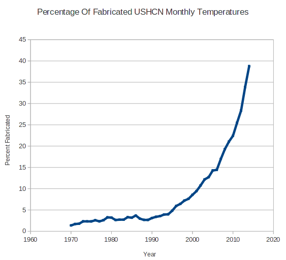 Thirty-nine percent of USHCN data is now fabricated, meaning that there is now 39% more monthly temperature data reported than measured, compared to less than 5% in 1990.