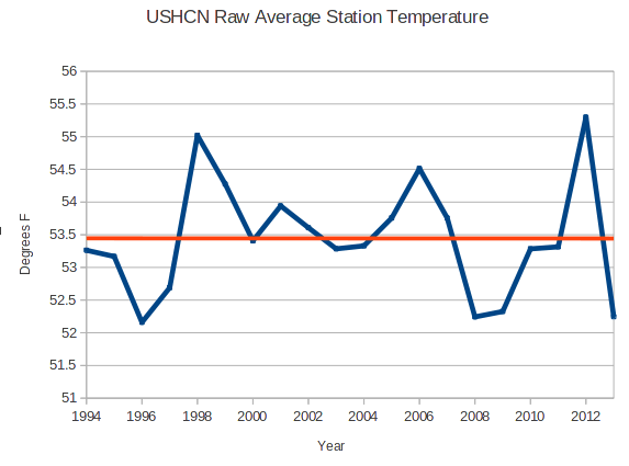 The graph below shows the difference between the average final USHCN station temperature, and the average raw USHCN station temperature. All reported warming in the US since 1994 is due to highly subjective adjustments by government scientists who personally benefit from global warming alarmism.