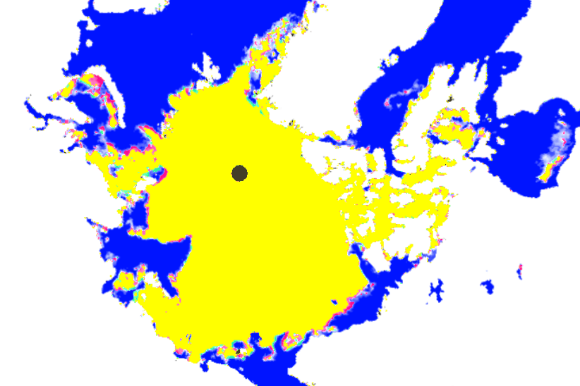 The Arctic Basin is at the peak of the melt season, but is barely melting. The map below shows changes in ice over the last three days. Green shows increased ice, and red shows decreased ice.