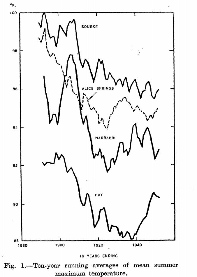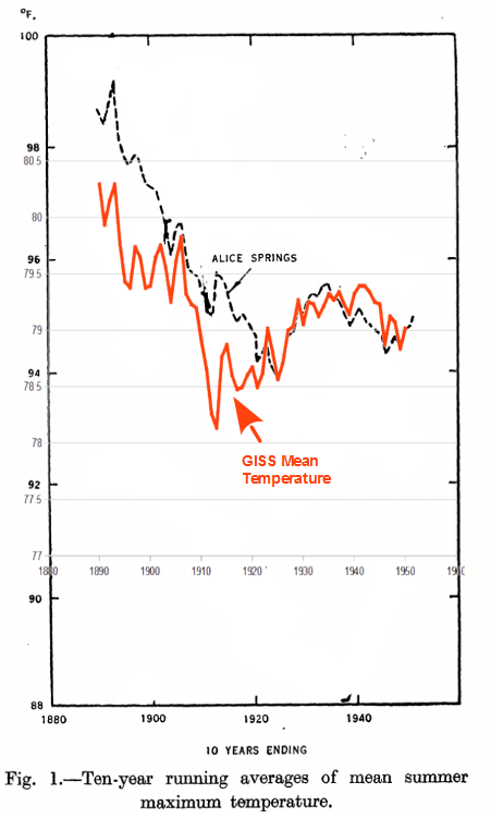 Jennifer Marohasy dug up a 1952 CSIRO paper, which shows sharp Australian cooling from the hot 1890s to the 1920s. I overlaid GISS average summer temperature 10 year ending mean for Alice Springs, on the equivalent CSIRO maximum temperature graph for Alice Springs.