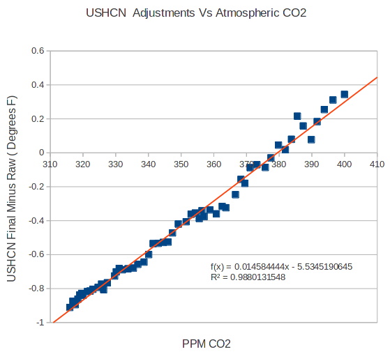 The graph below shows the relationship between atmospheric CO2 and the magnitude of USHCN data tampering. There is almost perfect correlation between the amount of CO2 in the atmosphere and how much cheating our friends at NCDC are doing with the US temperature record.