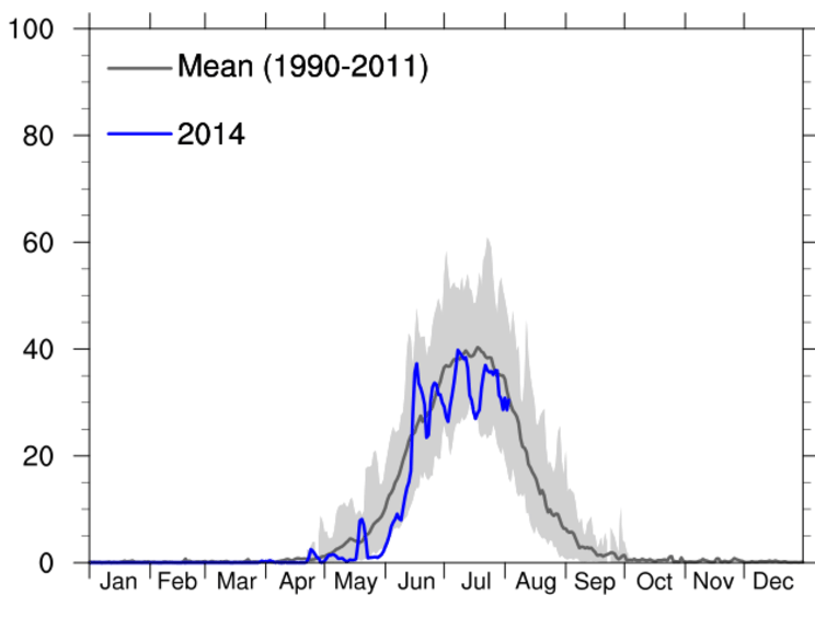 NSIDC shows Greenland melting out of control, far above average this summer.