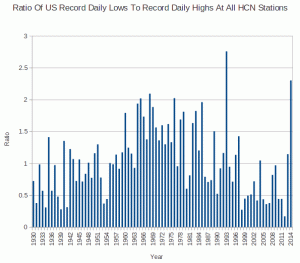 Here is another proxy which demonstrates that their claims are incorrect. The ratio of record daily minimums to record daily maximums in the US is the second highest since 1930. Only 1993 was higher, and that was due to volcanic dust from Mt. Pinatubo blocking the sun.