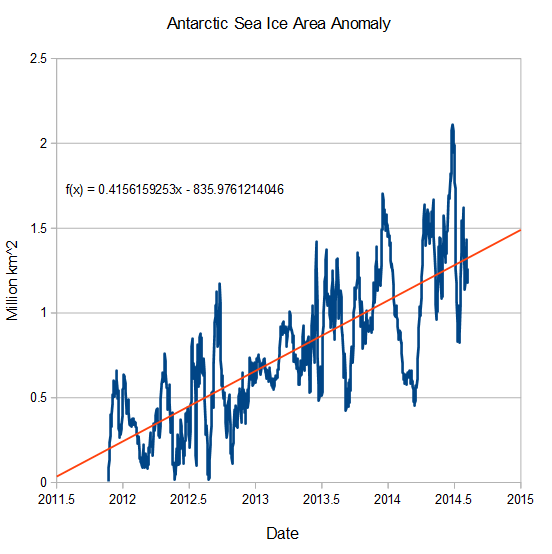 With Antarctic ice growing at record rates for the past 35 years, climate experts tell us that Antarctica is melting down. Sea ice extent has been above normal every day for the past 990 days and is growing at a rate of two Manhattans per day.