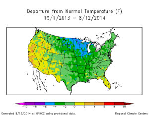 Temperatures have been below normal in 75% the US since October 1, 2013, with the average departure being -1.29 degrees.