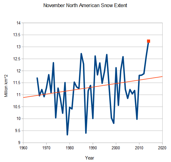 Contrary to the lies and forecasts of climate experts, November snow extent has been increasing and was at an all-time record high this year. This was due to a widespread intrusion of cold air at latitudes further south than normal.