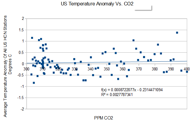 Before data tampering by NCDC, US temperatures show essentially zero correlation with atmospheric CO2. Climate sensitivity of zero.