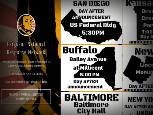 Remember back after the Michael Brown shooting and in the lead up to the Darren Wilson grand jury decision when I reported on the fact that “direct action trainings” for protesters were being held across the country, and highly organized protests were scheduled in some 83 cities (including one in Canada!) complete with a fancy social media campaign designed by skilled graphic artists?