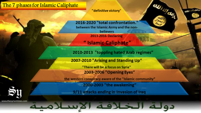 During the fourth phase, from 2010 to 2013, “Hussein writes that al-Qaida will aim to bring about the collapse of the hated Arabic governments.” Right on schedule, Mubarak was toppled in Egypt, Gadhafi in Libya and Ben Ali in Tunisia, with Assad facing an ongoing civil war in Syria. Then during the fifth phase, an “Islamic state, or caliphate,” would actually be declared. Musharbash wrote: “The plan is that by this time, between 2013 and 2016, Western influence in the Islamic world will be so reduced and Israel weakened so much, that resistance will not be feared.”