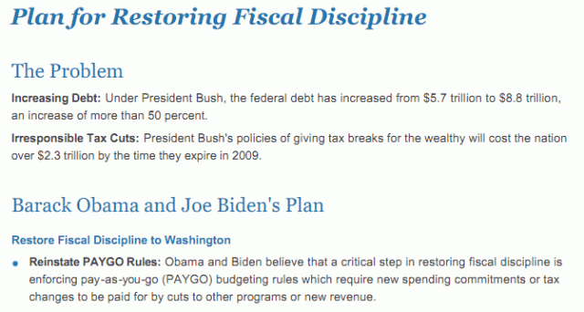 In 2008 Obama complained about Bush increasing the debt by $3 trillion, and promised to restore fiscal discipline.