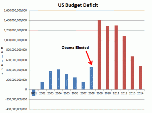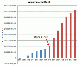 Instead, he tripled the deficit and has accumulated three times as much debt in six years as Bush did in eight. Obama’s smallest deficit is larger than Bush’ largest.