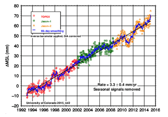 The University of Colorado shows sea level rising at a steady rate of 3.3 mm/year, which is a higher rate than 84% of tide gauges report