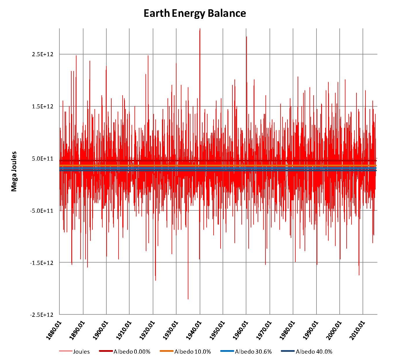 With that done we can see that the monthly NASA-GISS energy flows far and away exceed any possible variation in the planets albedo and so the values in the NASA-GISS table LOTI cannot be correct.