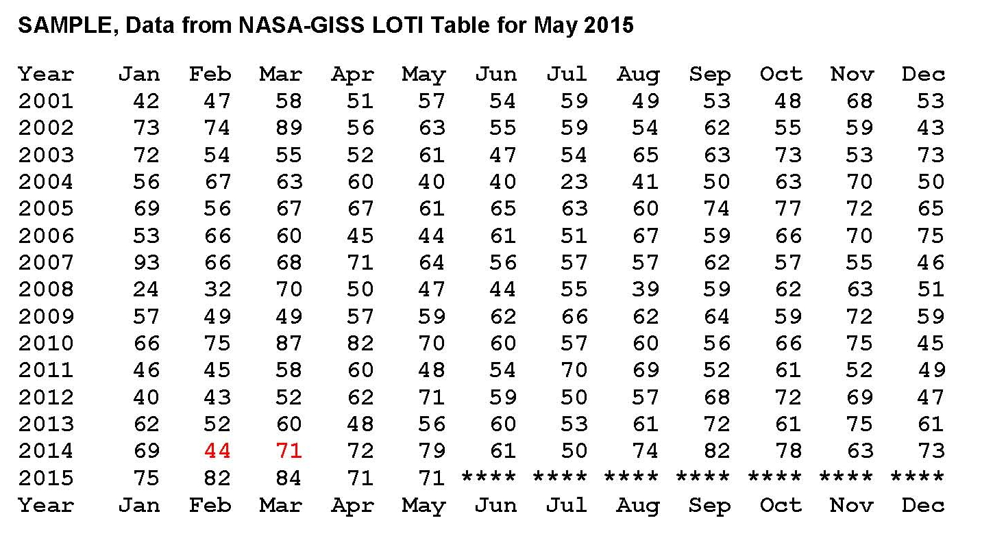 NASA publishes values representing the global surface temperature of the planet supposedly based on actual measurements processed in a complex algorithm they call homogenization. The resulting values are published each month in a table called the Land Ocean Temperature Index (LOTI) which runs from January 1880 to the current month, May in this case. The process they use is explained on their web site for those that are interested. However the values shown in their work seem to show very large temperature swings on a month to month basis and that did not seem reasonable to me, given this was Global temperatures. This prompted me to do a review of the process in June 2015 and that led to a previous draft paper which was modified to create this finished work.