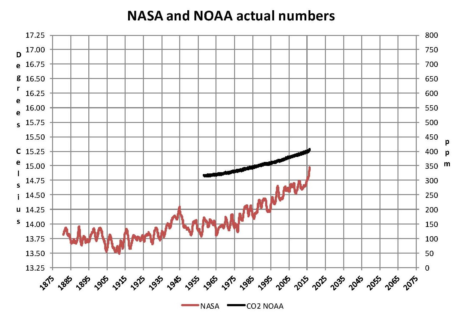 The analysis and plots shown here are based on the following two data series. First NASA-GISS estimates of a global temperature shown as an anomaly (converted to degrees Celsius) as shown in their table Land Ocean Temperature Index (LOTI) and shown in the following Chart as the red plot labeled NASA. This plot is shown as a twelve month moving average to minimize the large monthly swings and better show trends the scale for the temperatures is on the left. Second NOAA-ESRL Carbon Dioxide (CO2) values in Parts Per Million (PPM) which are shown in the following Chart as a black plot labeled NOAA. This plot is shown exactly as the data from NOAA is presented and not as a moving average the scale for CO2 is shown on the right.