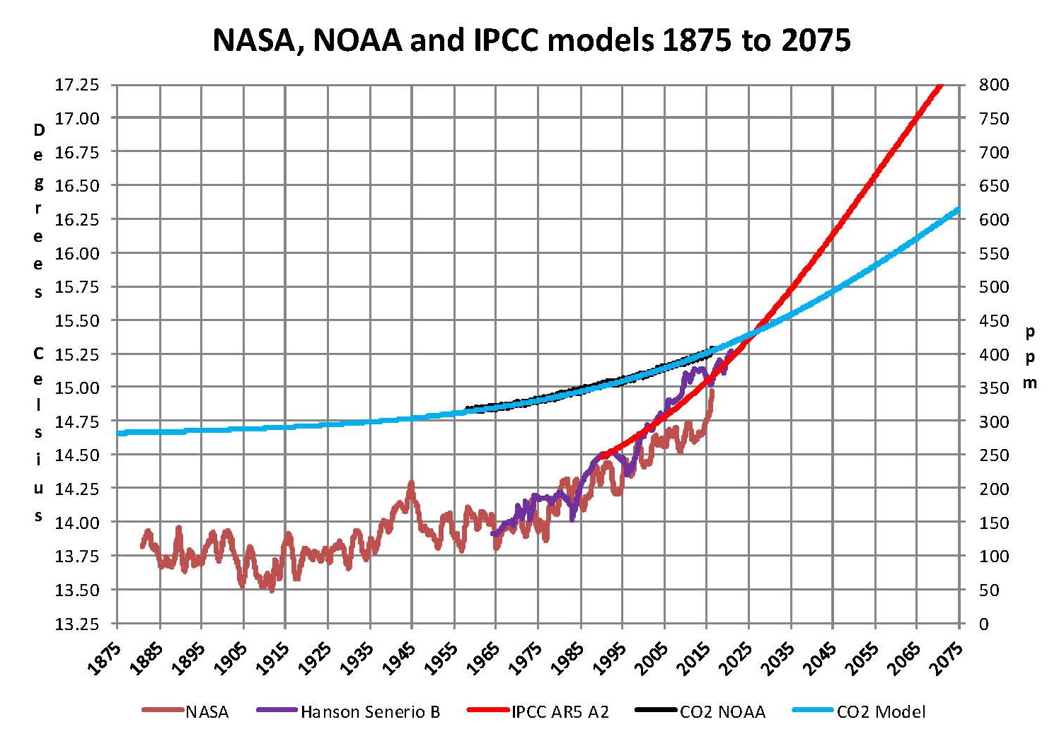 Now that we have a base to work with we are going to add to the previous Chart three things. The first is a trend line of the growth in CO2 since that is the entire basis for climate change according to the government through NASA and NOAA. That plot is superimposed over the black plot of the actual NOAA CO2 values as the cyan line labeled as the CO2 Model and one can see there is a very good fit to the actual NOAA values so there should be no dispute about its validity. This plot allows us to make projections as to future global temperatures according to the science. The second added item is James E. Hansen’s Scenario B data, which is the very core of the IPCC Global Climate models (GCM’s) and which was based on a CO2 sensitivity value of 3.0O Celsius per doubling of CO2. This plot is shown here in lavender and is part of a presentation that Hansen showed to congress in 1988 when the UN was about to set up the International Panel on Climate Change (IPCC) and this plot is labeled as Hansen Scenario B which Hansen stated was the most likely to happen based on his theories’. The third item is the current plot of the most likely temperature of the planet based on the growth of CO2 published by the IPCC. This plot is shown in Red and is labeled as IPCC AR5 A2 as that is the table where the data was found. This plot is a GCM computer projection of the planets temperature based to the complex relationships developed on the levels of CO2 by the IPCC through NASS and NOAA.