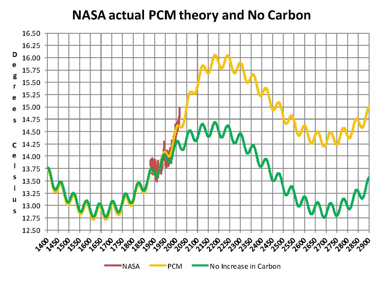 Lastly, the next chart shows what a plot of the PCM model, in yellow, would look like from the year 1400 to the year 2900. The plot matches reasonably well with history and fits the current NASA-GISS table LOTI data, in red, very closely, despite homogenization. I understand that this model is not based on physics but it is also not curve fitting. It’s based on observed reoccurring patterns in the climate. These patterns can be modeled and when they are, you get a plot that works better than any of the IPCC’s GCM’s. If the conditions that create these patterns do not change and CO2 continues to increase to 800 ppm or even 1000 ppm than this model will work into the foreseeable future. 150 years from now global temperatures will peak at around 15.75 to 16.00 degrees C and then will be on the downside of the long cycle for the next 500 years. The overall effect of CO2 reaching levels of 1000 ppm or even higher will be about 1.5 degrees C which is about the same as that of the long cycle. The Green plot on the Chart shows the observed pattern with no change in CO2 from the pre-industrial era of ~280 ppm.