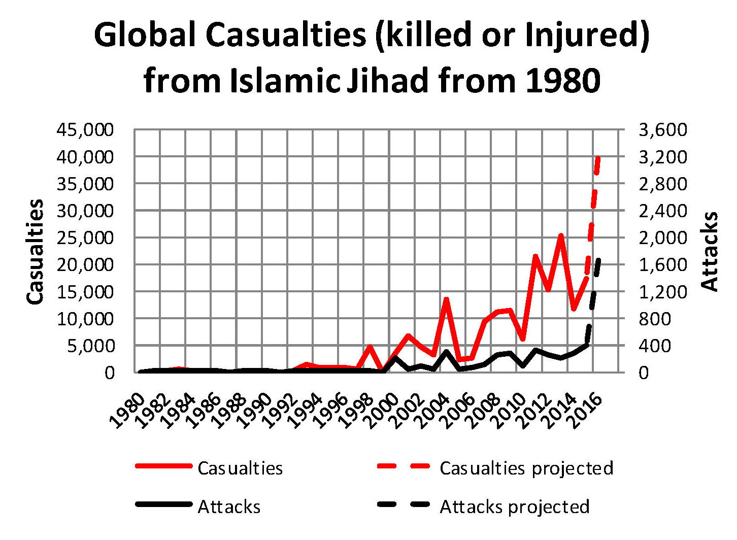 The following chart shows the number of people, many of them fellow Muslims, which have been killed or injured by Jihad worldwide since 1980. The numbers through 2015 are accurate and the one for 2016 is a projection based on the first seven months (July 31, 2016) including the most recent atrocity in Nice France. The observed trend shows that there is likely to be almost 40,000 people killed or injured this year. This is not a JV team and not a series of Lone Wolf events we are looking at over 105 people killed or injured each day though the date of this writing.