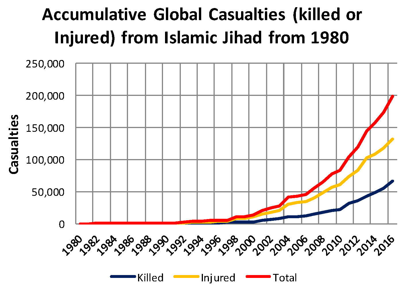 But as bad as what is shown in this chart are the accumulative totals since 1980 are much more dramatic. The next chart shows the accumulative totals for Killed and Injured since 1980 and is based on the same information shown in the first chart. Obviously and as can be clearly seen this all started in the ‘90s during the Clinton administration so I’m not sure we would really want another Clinton in office again, but the real issue is the silence from the Ulama.  The next chart shows only the actual numbers, not projections, so keep this in mind when you look at the totals as at the current rate of Jihad for 2016 (9,992 killed 14,461 injured for a total of 24,452 through July) that we are seeing they are likely to see a total well over 220,000 by year end.