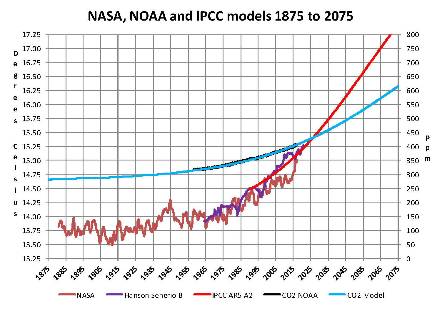 Now that we have a base to work with we are going to add to the previous Chart three things. The first is a trend line of the growth in CO2 since that is the entire basis for climate change according to the government through NASA and NOAA. That plot is superimposed over the black plot of the actual NOAA CO2 values as the cyan line labeled as the CO2 Model and one can see there is a very good fit to the actual NOAA values so there should be no dispute about its validity. This plot allows us to make projections as to future global temperatures according to the level of CO2. The second added item is James E. Hansen’s Scenario B data, which is the very core of the IPCC Global Climate models (GCM’s) and which was based on a CO2 sensitivity value of 3.0O Celsius per doubling of CO2. This plot is shown here in lavender and is part of a presentation that Hansen showed to congress in 1988 when the UN was about to set up the International Panel on Climate Change (IPCC) and this plot is labeled as Hansen Scenario B which Hansen stated was the most likely to happen based on his theories’. The third item is the current plot of the most likely temperature of the planet based on the growth of CO2 published by the IPCC. This plot is shown in Red and is labeled as IPCC AR5 A2 as that is the table where the data was found. This plot is a GCM computer projection of the planets temperature based to the complex relationships developed on the levels of CO2 by the IPCC through NASS and NOAA.