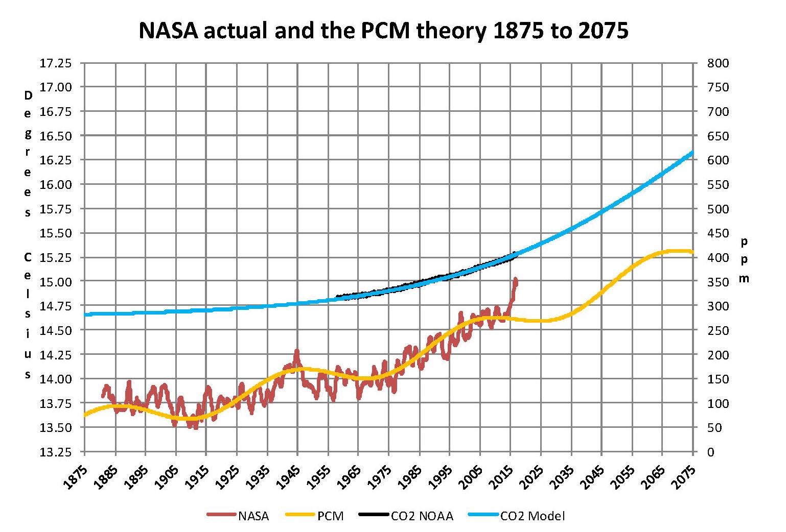 As can be seen in the following Chart the PCM there is a 69.1 year cycle that moves the trend line up and then down a total of 0.29O Celsius and we are now in the downward portion of that trend (-.01491O C per year) which will continue until around ~2035. This short cycle is clearly observed in the raw NASA data in the LOTI table going back to 1880. Then there is a long trend, 1036.7 years with an up and down of 1.65O Celsius (.00396O C per year) also observed in the NASA data. Lastly, there is CO2 adding about .0079O Celsius per year so currently they all basically wash out at -.0039O C per year, which matches the current holding pattern we are experiencing. After about 2035 the short cycle will have bottomed and turn up and all three will be on the upswing again. Note: the values shown here are only representative as the actual model uses many more places than what are shown here.