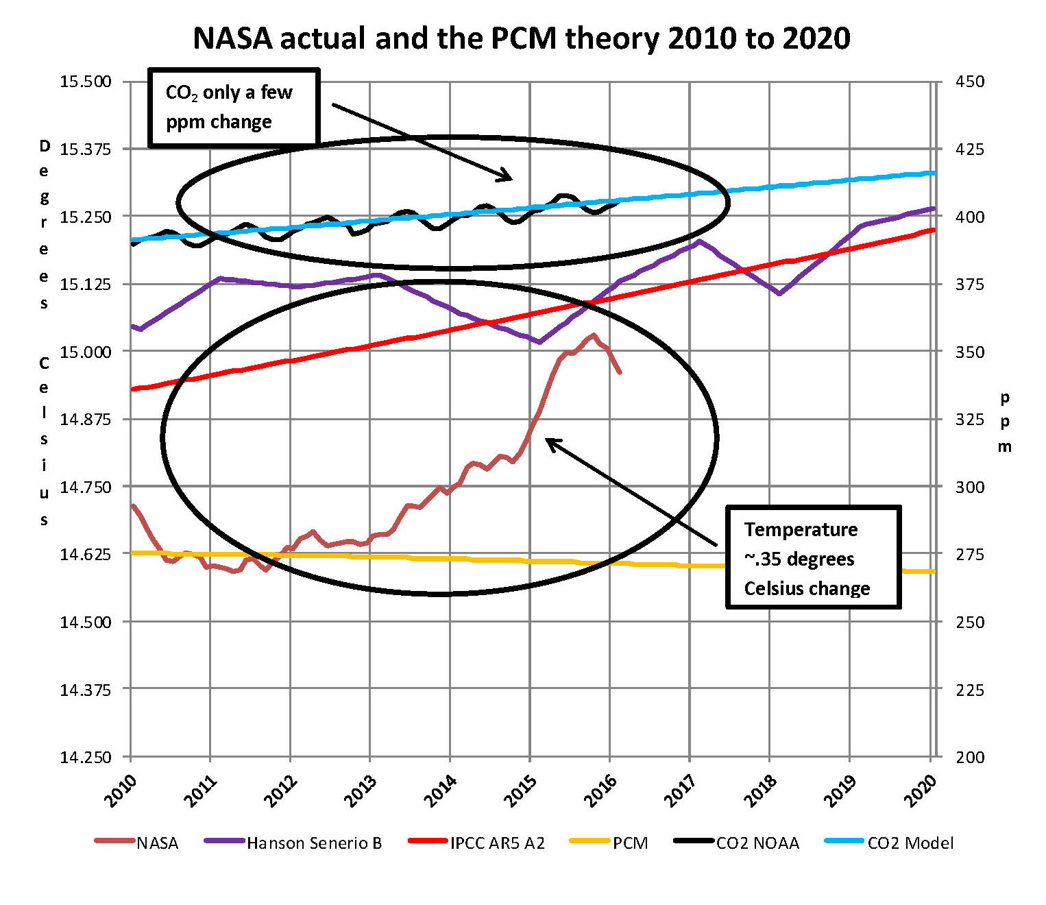 When using the 12 month running average for global temperatures up until 2014 the PCM model was within +/- .01 degrees of what NASA was publishing in their LOTI table since the early 1960’s as shown in the next Chart. Further the back projection of the PCM plot matched historical records and global temperatures going back past the time of Christ. It should also be consider that geologically CO2 levels have reached levels many times that of the current 400 ppm without destroying the planet so the current hysteria over the current small numbers can only be explained by political science not real science.