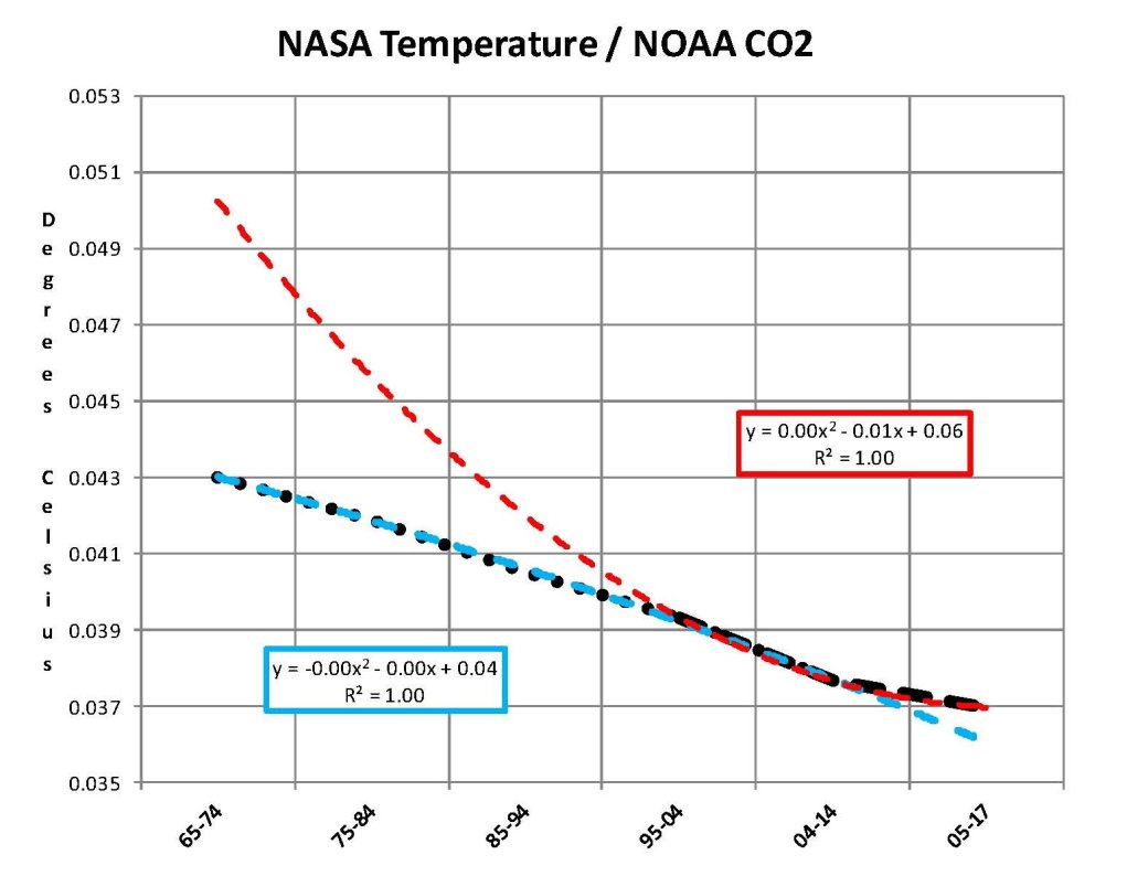 The next Chart is developed from the raw data from NASS and NOAA as shown in the first Chart. This plot was made first by adding ten years blocks of temperature and CO2 as indicated in the Chart and diving by 120 to give an average for each. Then the average Temperature was divided by the average CO2 to give degrees of temperature increase per PPM of CO2. After that was plotted it appeared that there were two different curves the first was from block 1965-1974 through block 2004-2014 shown as Black Dots and the second was from block 1995-2004 through block 2005-2016 shown as Black Dashes. When trend lines were added they were both almost perfect fits to the raw data and so you cannot see the data points very well on the Chart. These blocks were picked to represent the entire period of time where we had both NASA temperature data and NOAA Co2 levels.