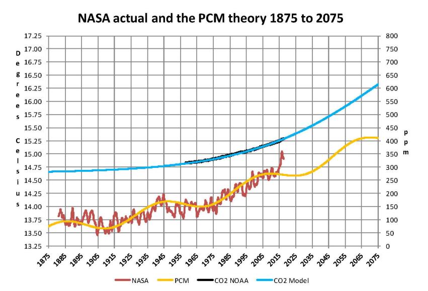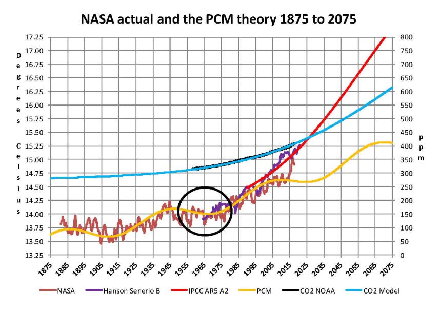 The result of looking objectively at the three possible sources of global temperature changes was a series of equations based on these observations that when added together produced a sinusoidal curve that seemed to follow NASA published temperatures very closely when first developed in 2007. Since this curve was based on observed temperature patterns it was called a Pattern Climate Model (PCM) which has been described in previous papers and posts on my blog and since it is generated by “equations” many assume it is some form of least squares curve fitting, which it is not. It does seem to be related to ocean currents where the bulk of the planet’s surface heat is stored.