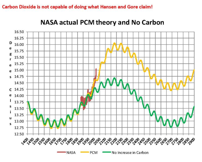 Lastly, the next chart shows what a plot of the PCM model, in yellow, would look like from the year 1400 to the year 2900. This plot matches reasonably well with recorded history and fits the current NASA-GISS table LOTI data, in red, very closely, despite homogenization. I understand that this model is not based on physics but it is also not true curve fitting. It’s based on observed reoccurring patterns in the climate. These patterns can be modeled and when they are, you get a plot that works better than any of the IPCC’s GCM’s. If the conditions that create these patterns do not change and CO2 continues to increase to 800 ppm or even 1000 ppm than this model will work well into the foreseeable future. 150 years from now global temperatures will peak at around 15.750 to 16.000 C and then will be on the downside of the long cycle for the next ~500 years.