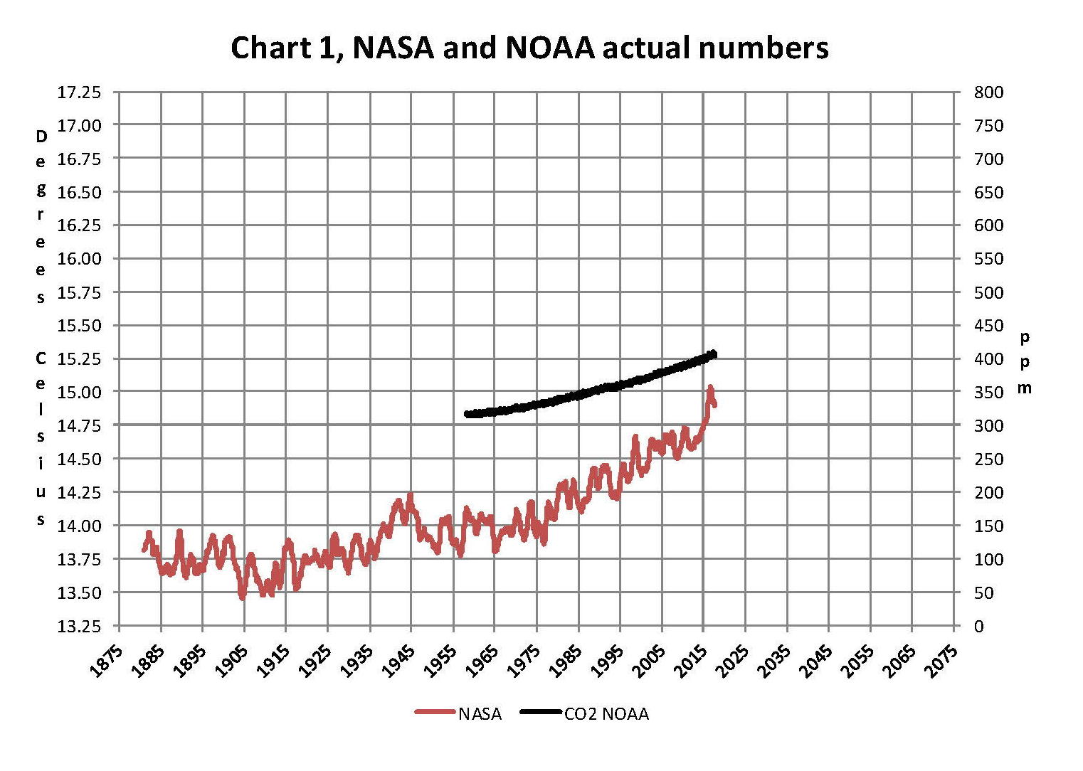 Next Chart 7 looks at the period from 2010 to 2020 so we can see where a change in CO2 of only a few ppm has caused a major change in the global temperature way beyond anything previously shown in any published NASA data. There are two black ovals on Chart 7 one at the top of Chart 7 which is a black oval around the CO2 levels from 2012 to 2016 and part of 2017 and it’s very obvious that there has been very little change, maybe 7 ppm or about 1.9%. Then at the bottom of Chart 7 is another black oval around the NASA global temperature levels for the same period and its very obvious that there has been a large change, almost .50 degrees Celsius or about 3.1%. There has never been such a large increase in temperature from such a small increase in CO2. By contrast the previous comparable period of the last part of 2010 through 2013 shows about the same increase for CO2 at 1.1% but no increase for global temperature but actually small decrease.