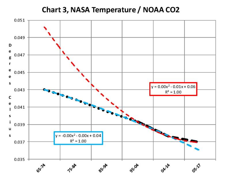 Next we have Chart 3 which is developed from the raw data from NASS and NOAA as shown in Chart 1. This plot was made first by adding ten years blocks of temperature and CO2 as indicated in the Chart 1 and diving by 120 to give an average for each. Then the average Temperature was divided by the average CO2 to give degrees of temperature increase per PPM of CO2. After that was plotted it appeared that there were two different curves. The first was from block 1965-1974 through block 2004-2014 shown as Black Dots and the second was from block 1995-2004 through block 2005-2017 shown as Black Dashes. When trend lines were added they were both almost perfect fits to the raw data and so you cannot see the data points very well on Chart 2. These blocks were picked to represent the entire period of time where we had both NASA temperature data and NOAA CO2 levels.