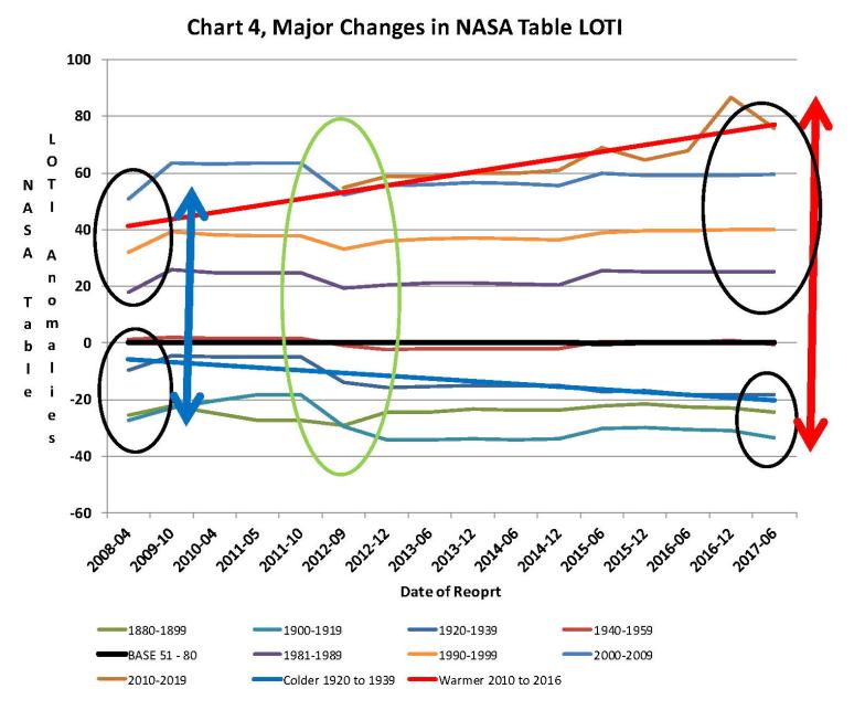The original goal was to see if the changes were just random or rounding errors. If that was so then they would wash out over time especially if I grouped the monthly data into blocks. I’ve used both 10 year (120 values) and 20 year (240 values) blocks which would be enough to maintain a fixed number if it was random or rounding. What I found was something quite different after I had a dozen or so columns in the spreadsheet, it appeared that NASA was making the past colder and the present warmer. And the purpose of the previous two Charts 3 and 4 is to show the result. Chart 4 is a bit complex but I have not found a better way to show what happened.