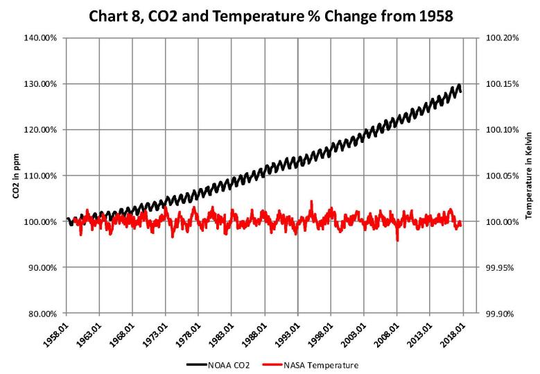 To show this graphically Chart 8 was constructed by plotting CO2 as a percentage increase from when it was first measured in 1958 the Black plot, the scale is on the left and it shows CO2 going up 28.3% by August of 2017. That is a large change as anyone would agree. Now how about temperature, well when we look at the percentage change in temperature using the proper units Kelvin we find that the changes in global temperature are almost unmeasurable. The red plot, also starting in 1958, shows that the thermal energy in the earth’s atmosphere has varied by less than +/- .17%; while CO2 has increased by 28.3% which is over 80 times that of increase in temperature. So is there really a problem here?