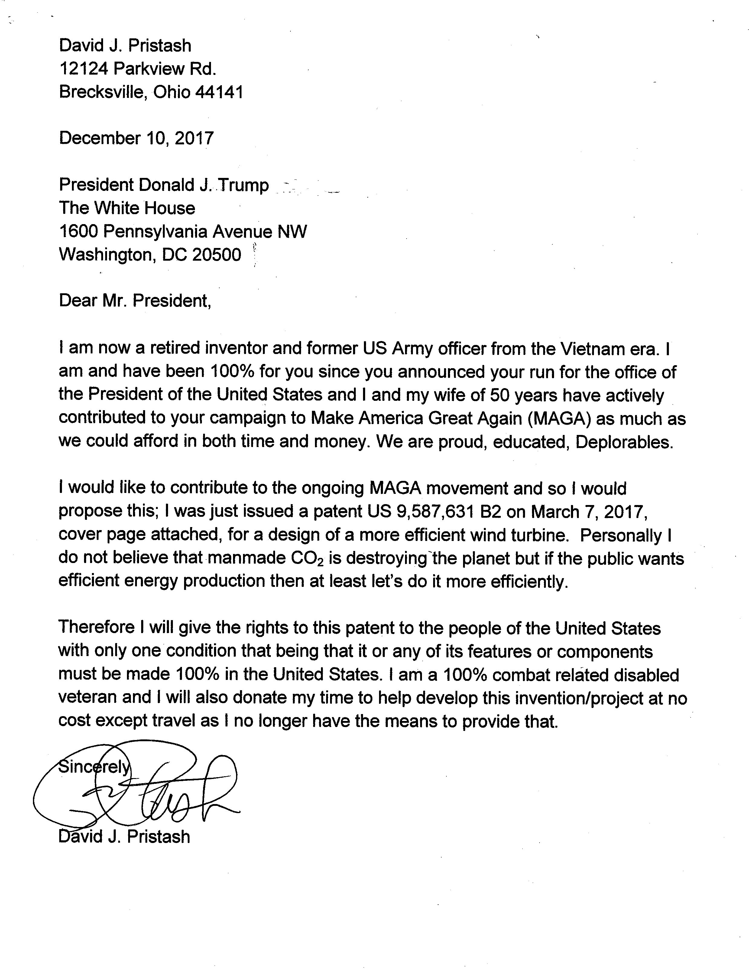 Below is a copy letter I sent to the President two weeks ago to help him in his MAGA program. I’m an inventor and in the spirit of making America Great Again, I have offered to give all the technology embodied in my latest patent (first page image below the letter) to any company that will use any of that technology to build products or components in the United States free of any strings. Its a gift to my country for the privilege of living here.