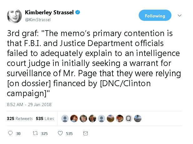 Think about it. The Nunes memo was available to congress for over a week, and not a single -substantive- material leak came out. Yet, within HOURS of the Justice Department having access to the memo, the New York Times is writing about specific details contained within the memo: