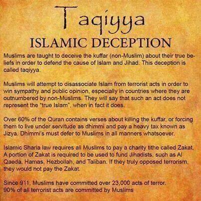 - Takiyya – Saying something untrue about the Muslim identity. Mohammed used deception when he signed a 10-year treaty with Meccans, allowing him access to their city while he secretly prepared for a takeover. From Mohammed to Saddam Hussein, promises made to non-Muslims are non-binding.