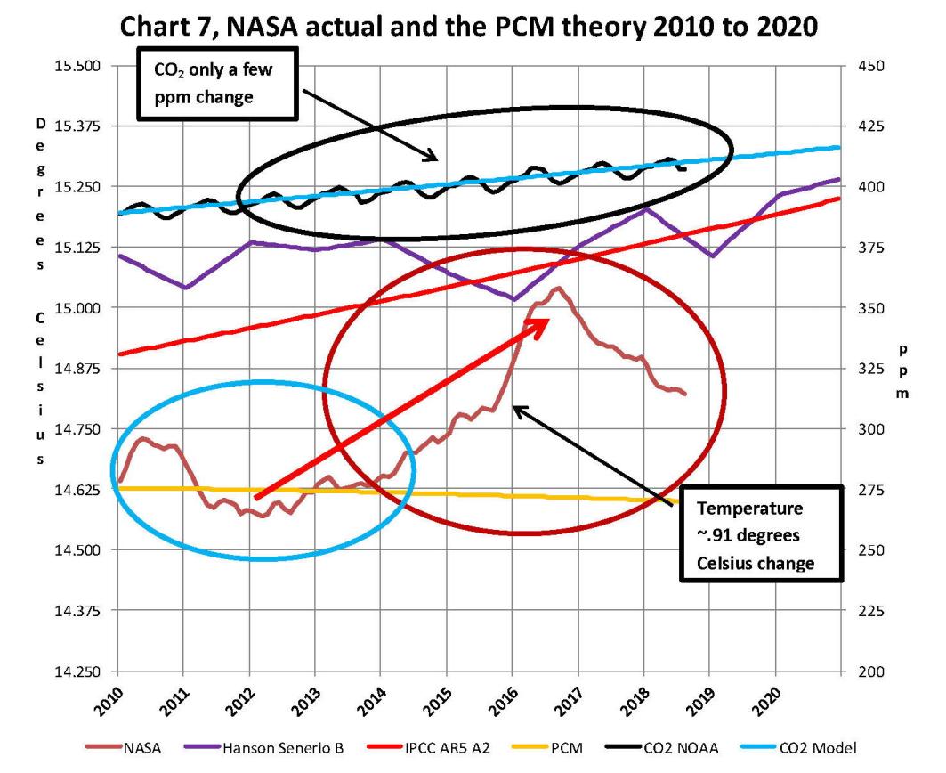 Chart 7 looks at the period from 2010 to 2020 so we can see where a change in CO2 of only a few ppm has caused a major change in the global temperature way beyond anything previously shown in any published NASA data. There are three ovals on Chart 7 one at the top of Chart 7 which is a black oval around the CO2 levels from 2010 to 2018 and it’s very obvious that there has been very little change, maybe 3 ppm a year Then at the bottom of Chart 7 is dark red oval around the NASA global temperature levels from 2013 to 2018 and its very obvious that there has been a sudden large change, almost .50 degrees Celsius in 3 years. There has never been such a large increase in temperature from such a small increase in CO2. By contrast the previous comparable period of the last part of 2010 through 2013 Blue oval shows about the same increase per year for CO2 but global temperature decreased.