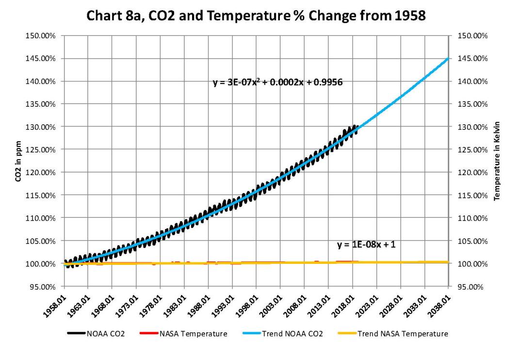 I agree with the basic premise of Murray; but I have one correction we are in a pause not a mini ice age. The long cycle is likely not to go down, easing all the previous increase for another ~100 years we are only ~900 years into the ~1000 year primary cycle. The base we are measuring from is 14.0 Degrees Celsius (an arbitrary number) and the 2.0 Degrees Celsius limit that is the point of no return according to AOC is from that point. We are now just under 15.0 Degrees Celsius so there is only 1.0 Degrees Celsius of their buffer left. The following charge shows a simple statistical projection based on current NOAA and NASA data. The chart is in percentages but it shows us that the amount of heat in the atmosphere is not likely to exceed 160 Degrees Celsius until after 2050 so all the projects are going to be 100% wrong!