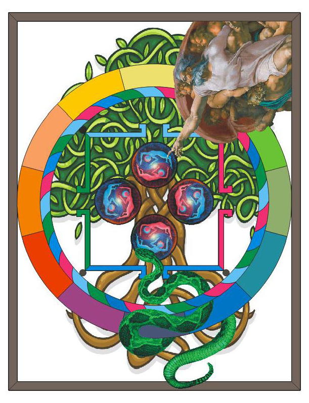 This paper will be focusing on the Classical Greek views and how the Classical Greek view transitioned into Contemporary Philosophy and the Progressive Atheist belief structure starting just before the change from the 19th century to the 20th century. This was, of course, when Marxism took hold of (pseudo) intellectual thought. Those two, Contemporary and Progressive Atheist, belief systems currently make up most of what we call Western Civilization. The first tree Chapters are very important and all else is derived from what is presented there. If you can not at minimum agree that my proposition is possible then there would be little advantage to read the rest of the book. Western Civilization is in a period that will either end it or transform it into something unknown; these these kinds transition rarely go without major conflicts. According to reliably sources I know we will be though this period by mid century. Below is an motif image I created representing the universe we live in, its explained in detail in chapter two of the book.