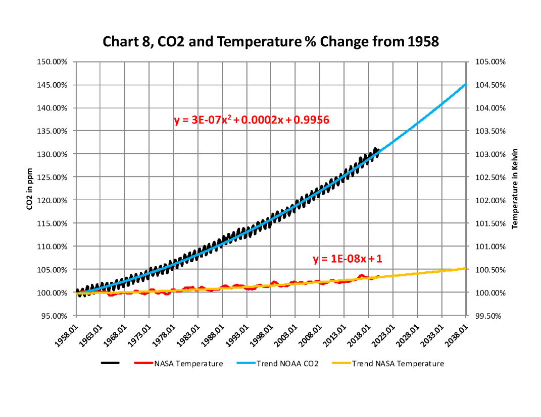 The next chart is Chart 8a which is the same as Chart 8 except for the scales which are the same for both CO2 and Temperature. As you see the increase in energy, heat, is not visually observably in this chart hence the need for the previous chart 8 to show the minuscule increase in thermal energy shown by NASA in relationship to the change in CO2. Based to these trends, determined by excel not me, in 2028 CO2 will be 428 ppm and temperatures will be 15.0o Celsius and in 2038 CO2 will be 458 ppm and temperatures will be 15.6O Celsius. This is what the data shows no matter what the reasons are, so I have no idea how the IPCC gets to predict that the world will end in ten or even twenty years.