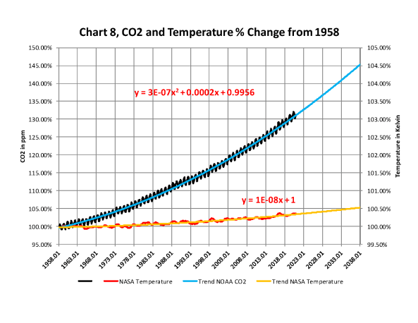The next chart is Chart 8a which is the same as Chart 8 except for the scales which are the same for both CO2 and Temperature. As you see the increase in energy, heat, is not visually observably in this chart hence the need for the previous chart 8 to show the minuscule increase in thermal energy shown by NASA in relationship to the change in CO2. Based to these trends, determined by excel not me, in 2028 CO2 will be 428 ppm and temperatures will be a bit over 15.0o Celsius and in 2038 CO2 will be 458 ppm and temperatures will be 15.6O Celsius. This is what the data shows no matter what the reasons are, so I have no idea how the IPCC gets to predict that the world will end in ten or even twenty years.