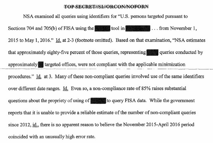 There were tens-of-thousands of unauthorized search queries; and as Judge Collyer stated in her report, there is no reason to believe the 85% non compliant rate was any different from the abuse of the NSA database going back to 2012.