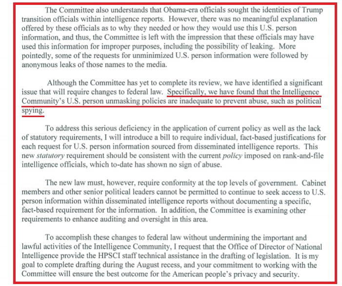 Back in 2017 when House Intelligence Committee Chairman Devin Nunes was working to reauthorize the FISA legislation, Nunes wrote a letter to ODNI Dan Coats about this specific issue: