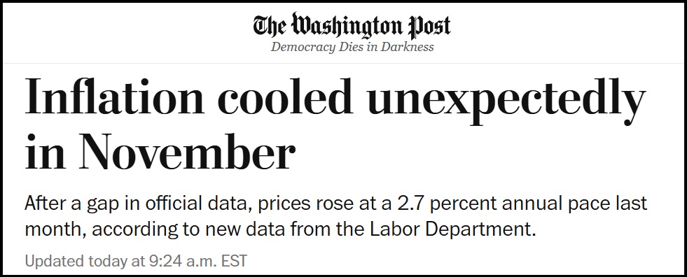 The Bureau of Labor and Statistics (BLS) has released the November Consumer Price Index (CPI) [DATA HERE] showing the rate of inflation has dropped to 2.7% overall, with core inflation at 2.6%. This is a significant drop from expectations by financial pundits and pontificating economic media.
