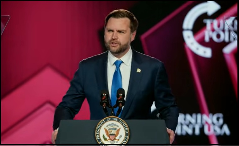Following a strong endorsement of JD Vance by Charlie Kirk’s widow, Erika Kirk, Vice President Vance appears at the Turning Point USA event to deliver the keynote address. The crowd chanted, “JD, JD, JD!”