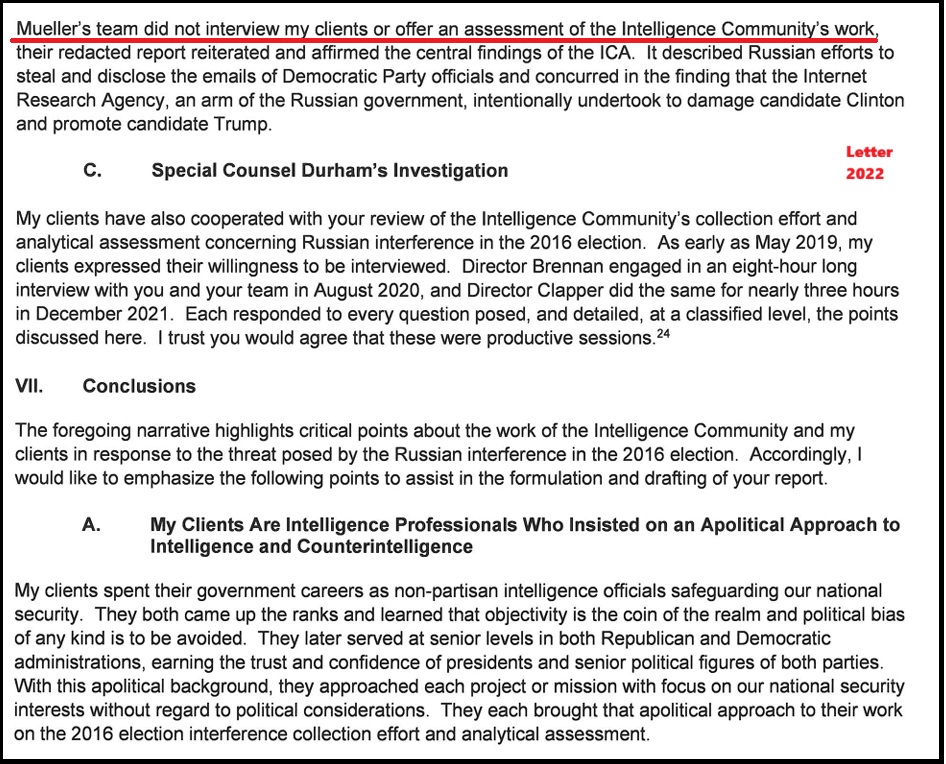 In 2025, Brennan is telling the Florida court the Intelligence Community Assessment (ICA) conclusion was confirmed by Special Counsel Robert Mueller in a “very serious review.” However, in 2022 Brennan told John Durham that Robert Mueller never interviewed him or offered an assessment of the ICA; Mueller just regurgitated it.