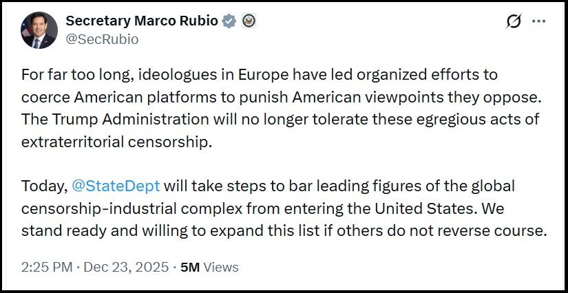 Secretary of State Marco Rubio said the first five people targeted with visa bans “have led organized efforts to coerce American platforms to censor, demonetize and suppress American viewpoints they oppose.”